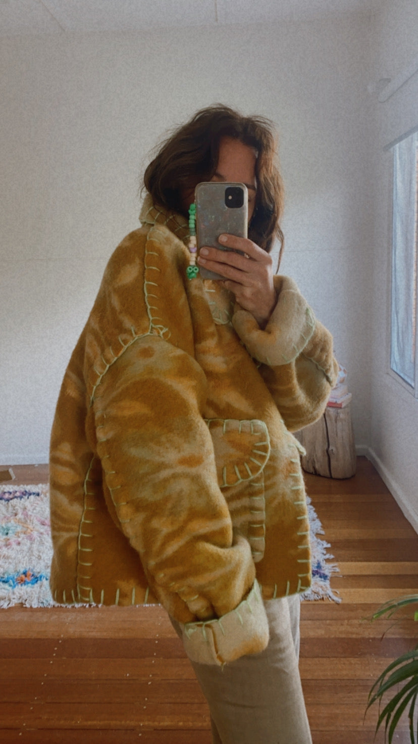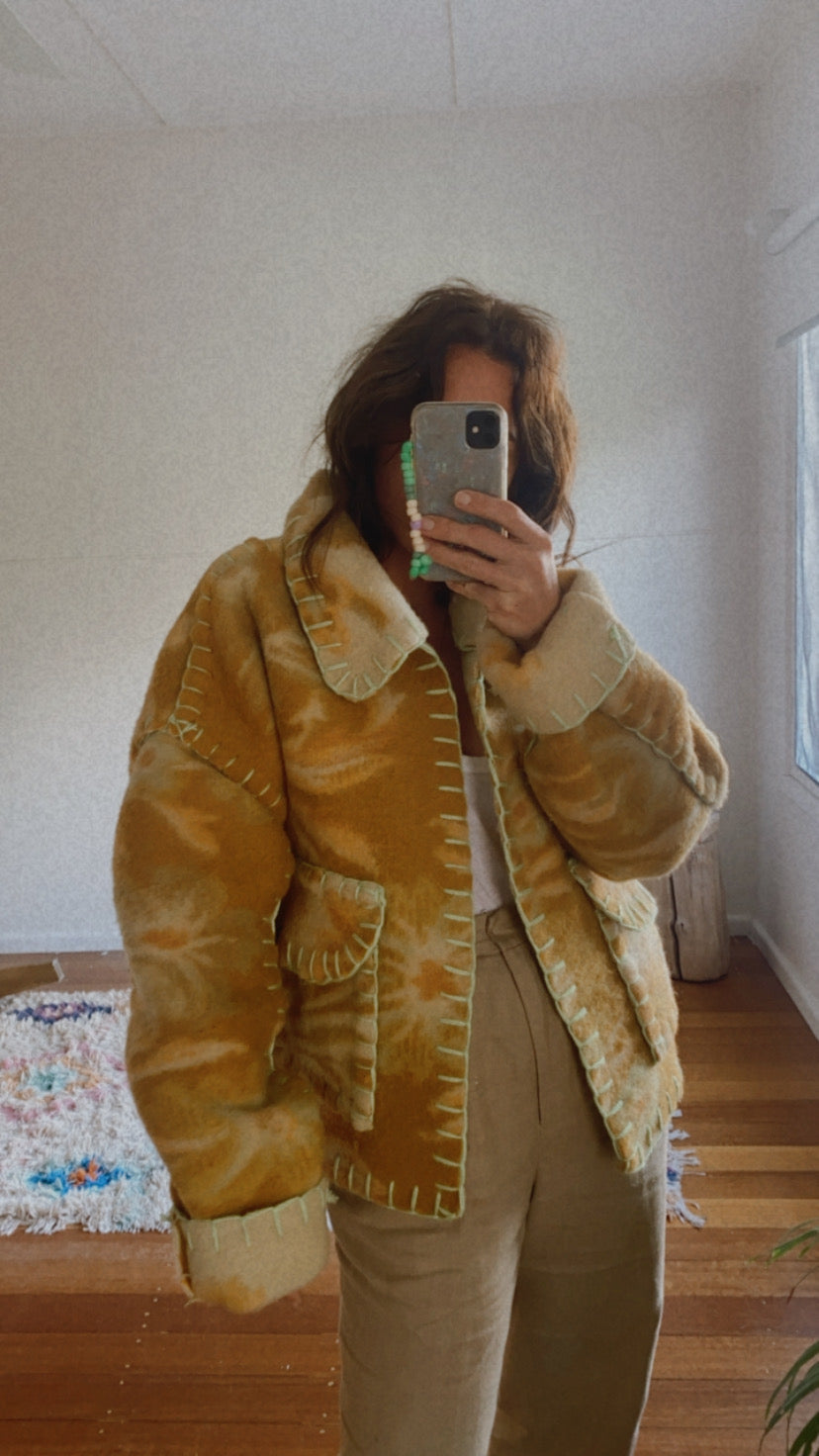 Beautiful vintage blanket handmade into a statement jacket with a wool blanket stitch. Jacket is one size in a boxy shape with front pockets. All jackets are one of a kind and made with lots of love.