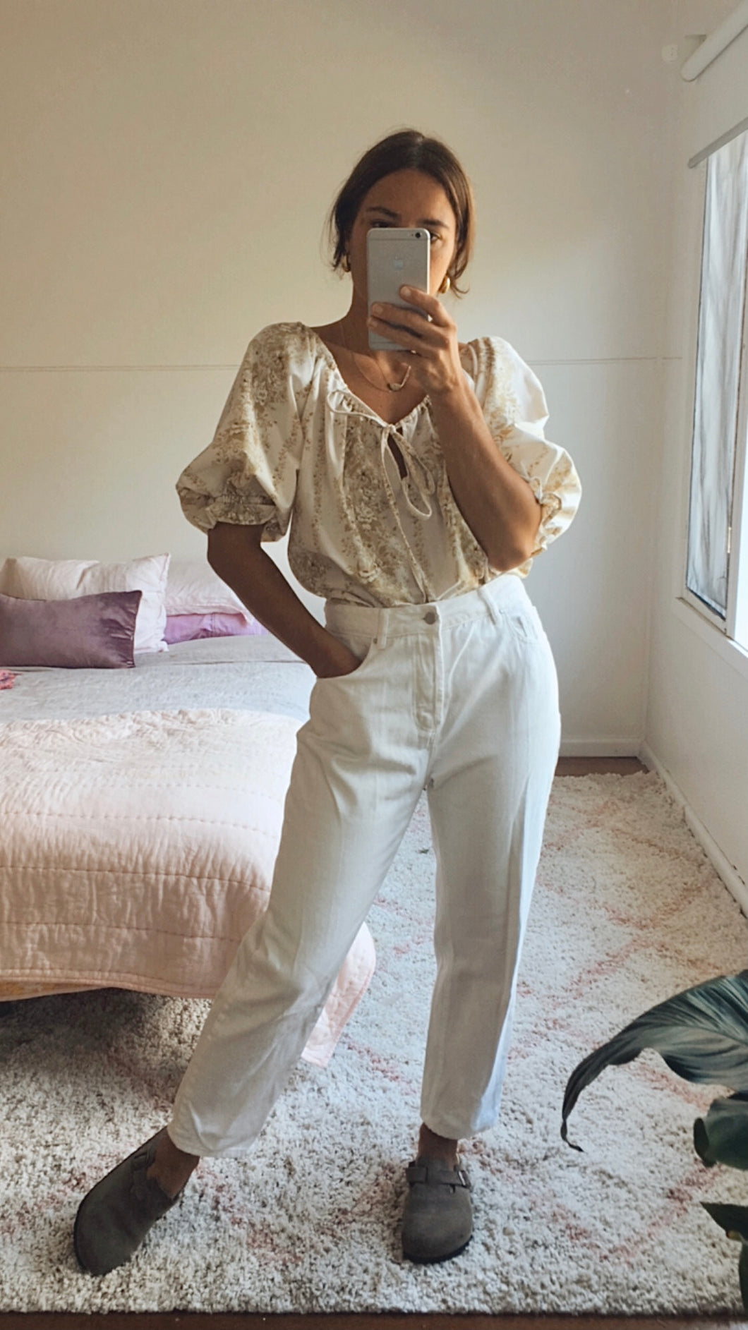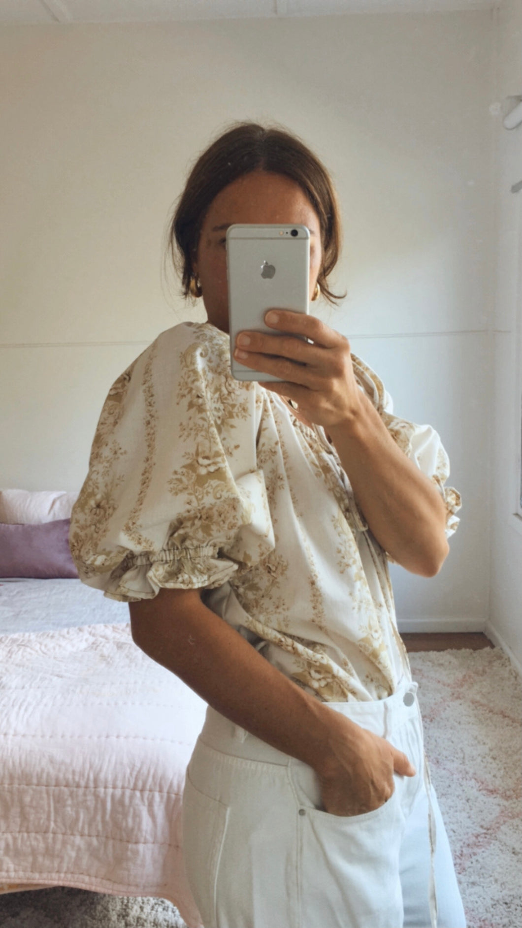 The Josie top with a tie front gathered neck line and puff sleeves.