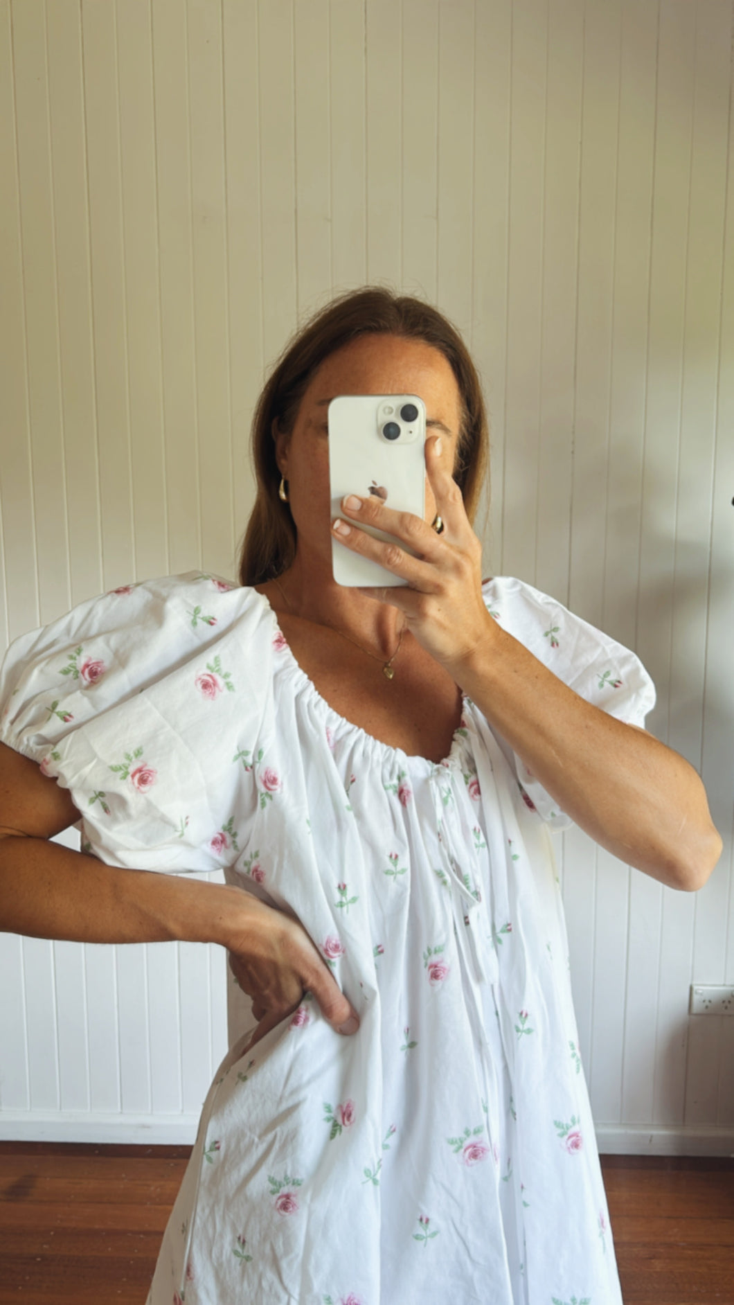 The Sweetest little smock dress with a keyhole tie front gathered neck line and puff sleeves.